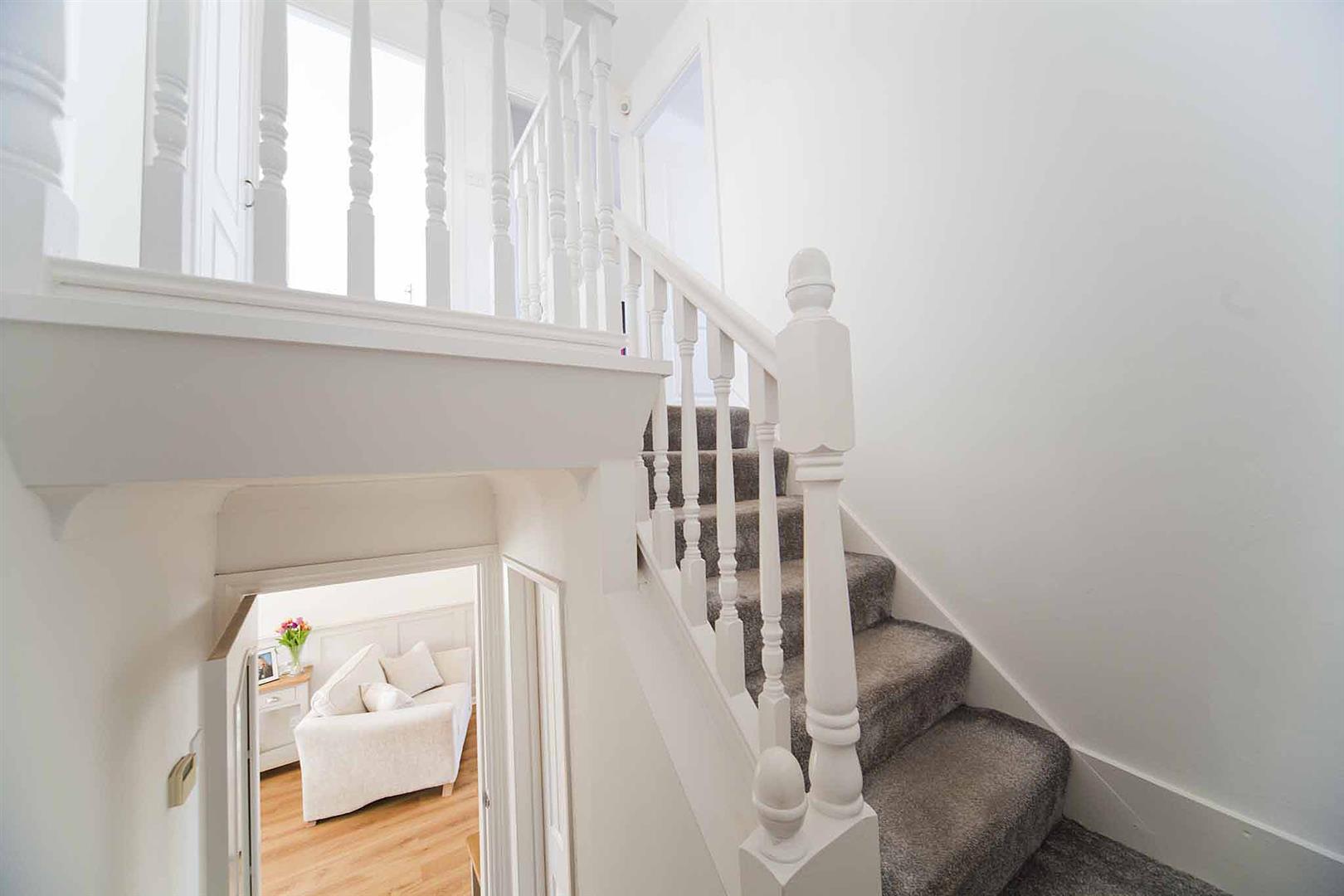 Turned staircase to the first floor accommodation, under the stairs fitted storage cupboard.