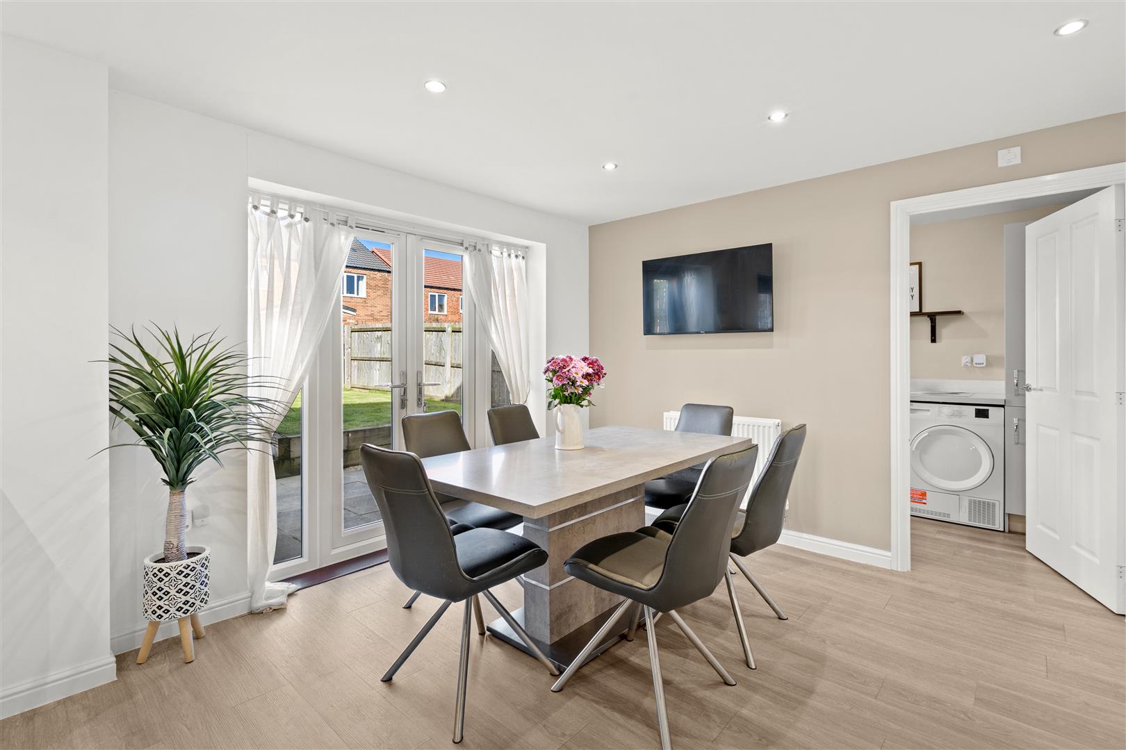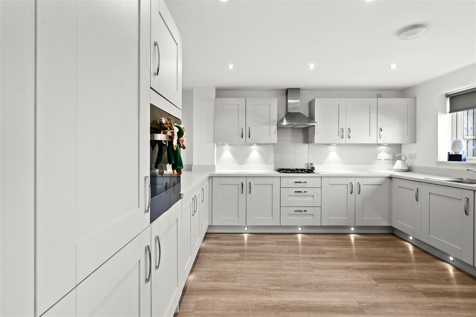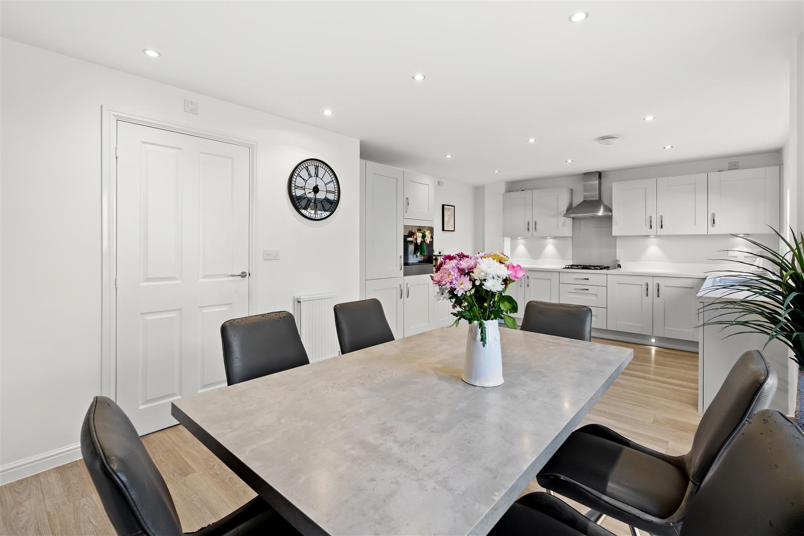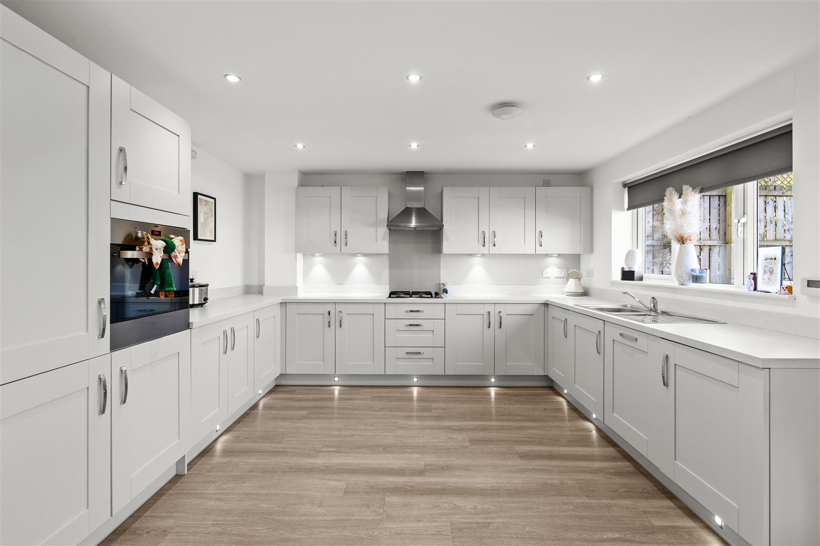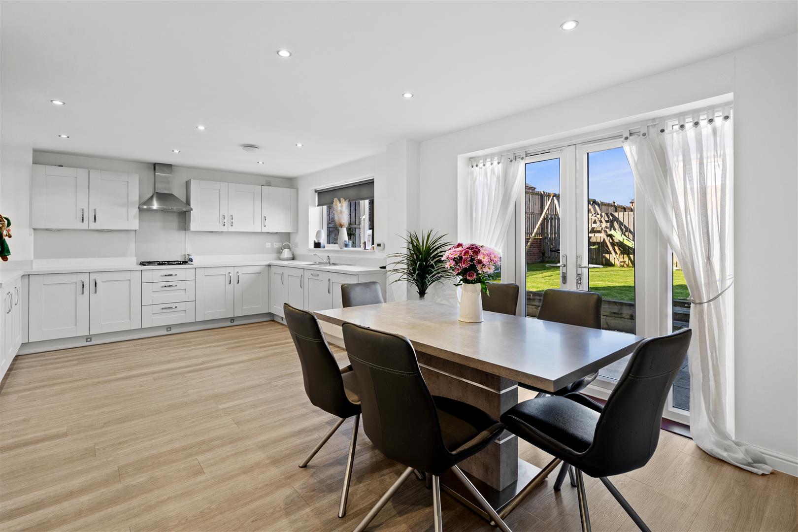 Fabulous open concept kitchen diner fitted with an array of contemporary larder, wall, base and drawer cabinetry, complimentary solid quartz countertops, cabinet lighting, integrated oven, integrated gas hob, stainless multifunction extractor hood, integrated dishwasher, integrated fridge freezer, stainless one and a half bowl sink with chrome mixer swivel tap, immaculate decor, recessed spotlights, ample dining space, modern flooring, French doors opening to the rear garden.