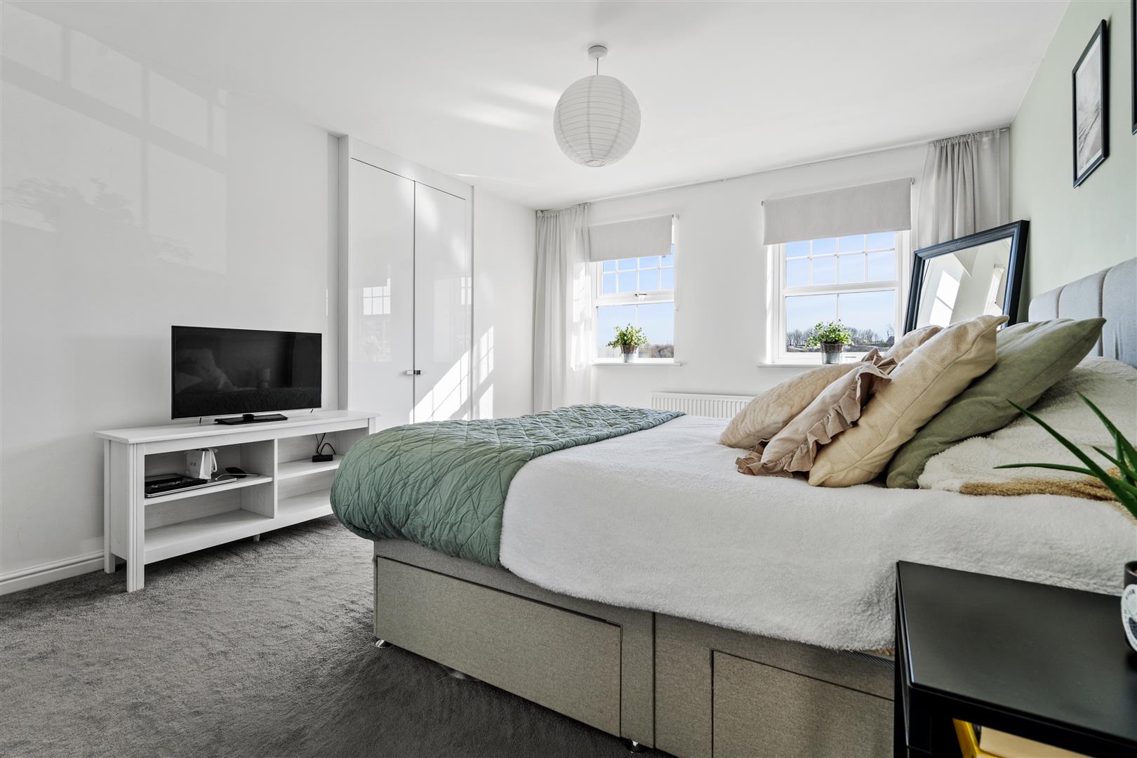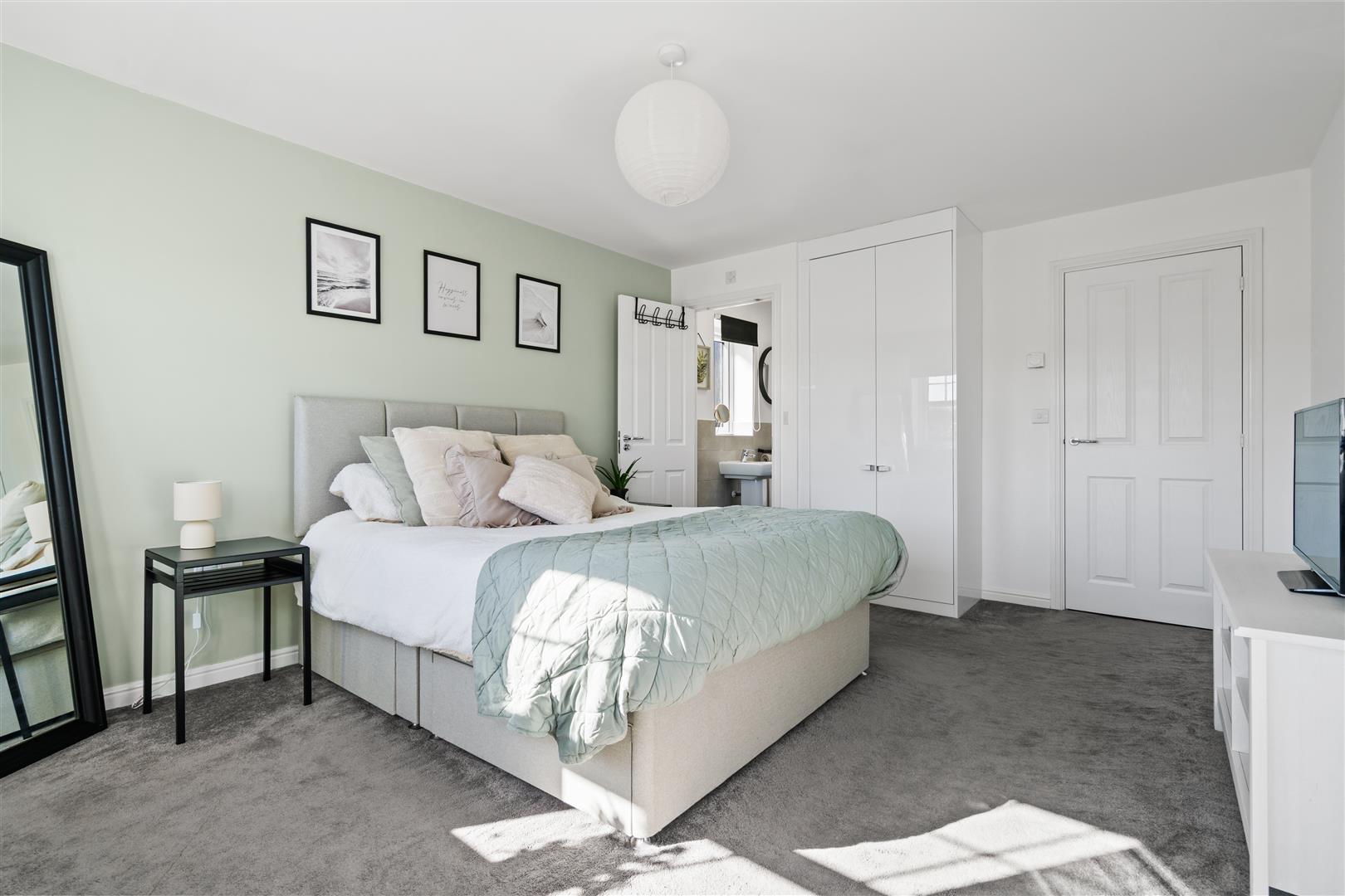 Master double bedroom with twin windows to the front elevation, two fitted wardrobes, stylish decor and access to;