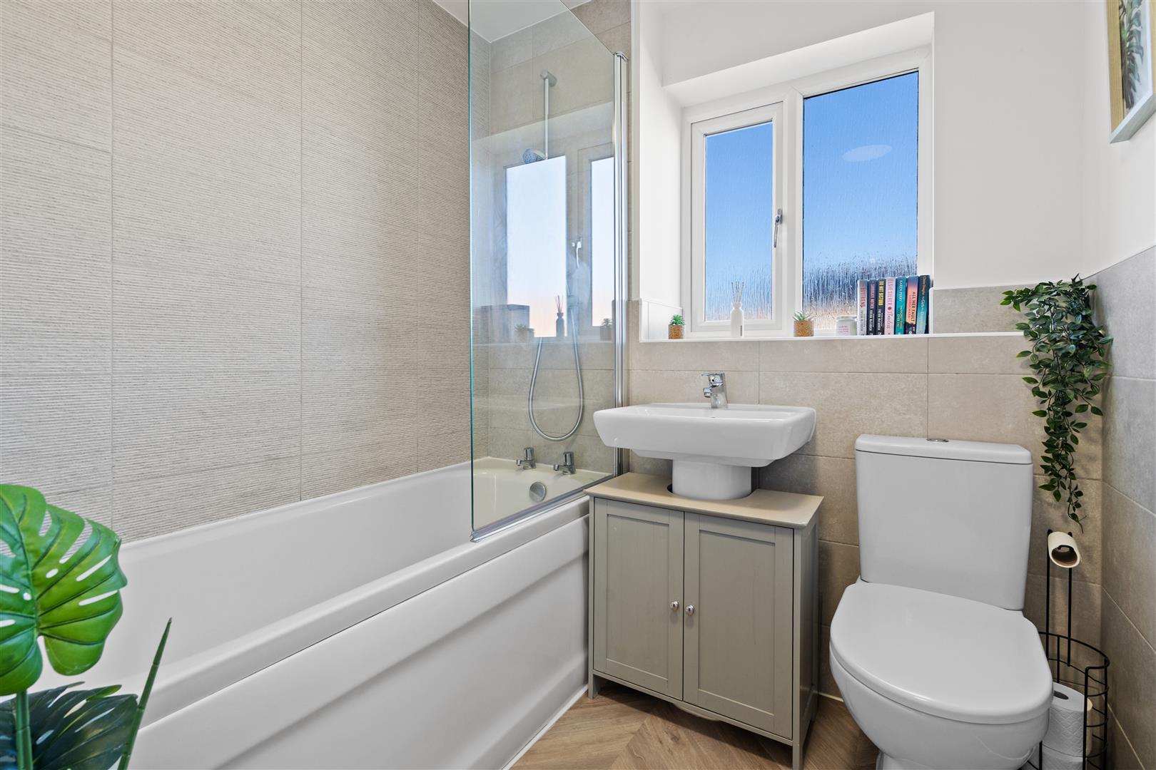 The superb family bathroom comprises bath with over bath shower, glass shower screen, close coupled WC and pedestal wash basin in desirable white porcelain with chrome fittings, tasteful tiling, excellent flooring.