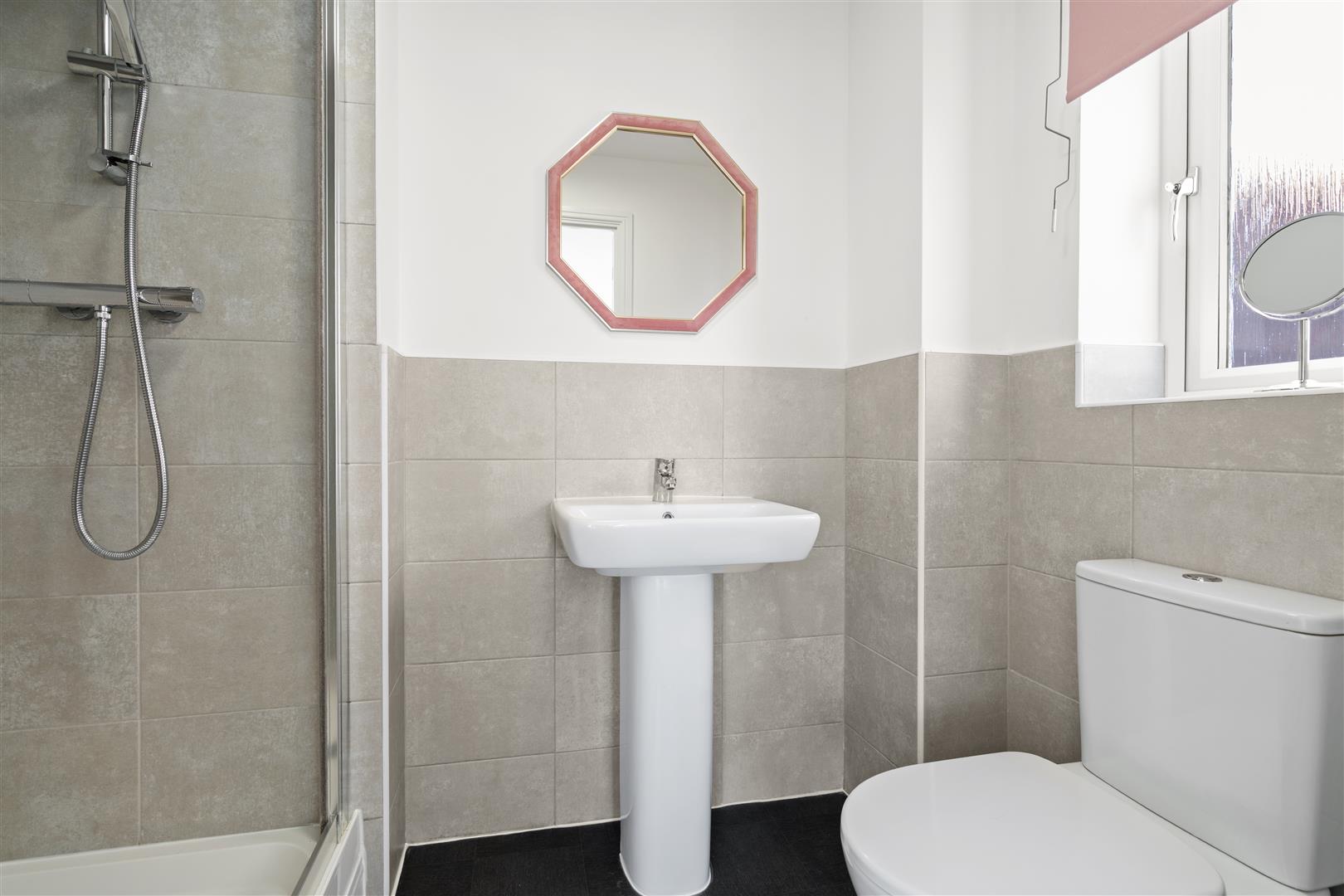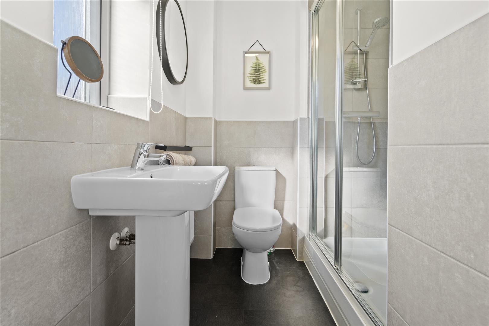 En suite shower room which comprises double shower enclosure, close coupled WC and pedestal wash basin with fabulous tiling.