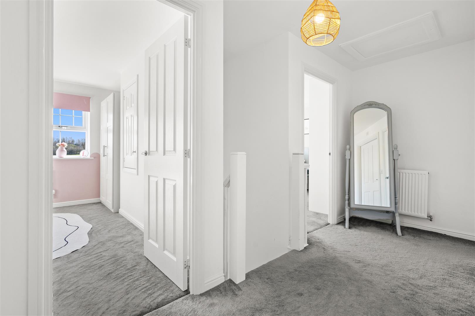 To the first-floor landing there is a fitted storage cupboard, loft hatch and access to;