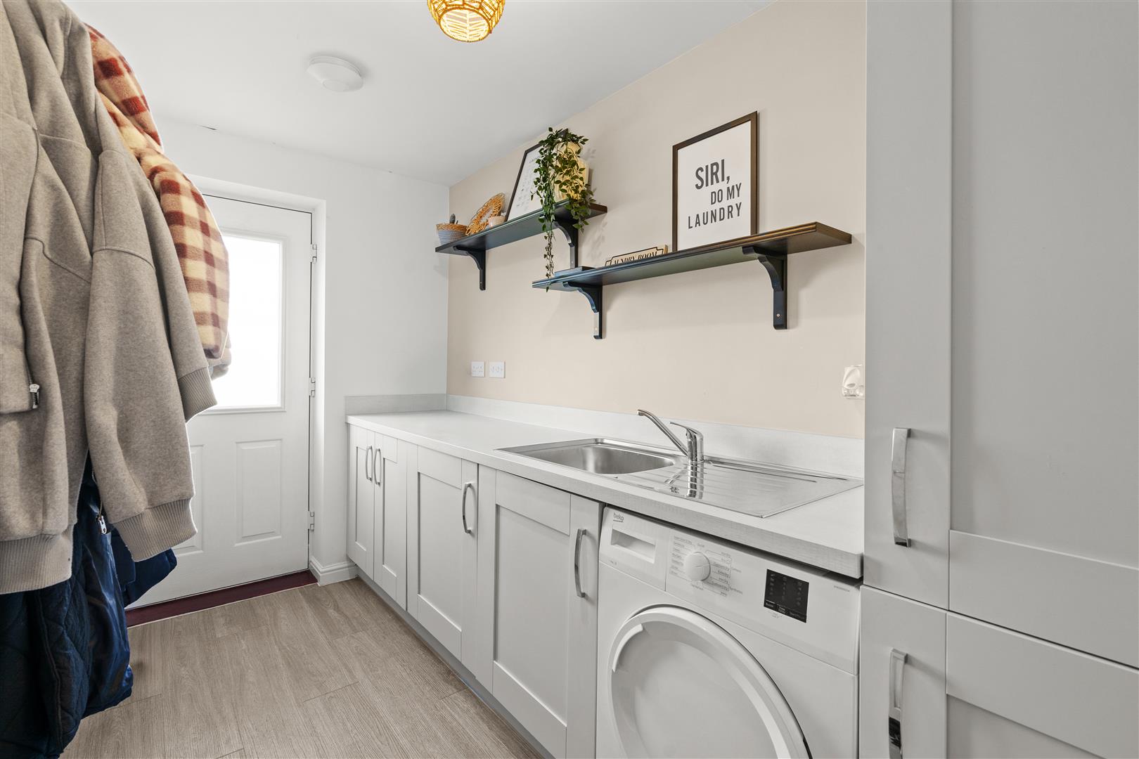 Useful utility room fitted in keeping with the kitchen with larder and base cabinets, stainless sink with chrome mixer swivel tap, plumbing for washing machine, solid quartz countertops, immaculate decor, stylish flooring, exterior access door.