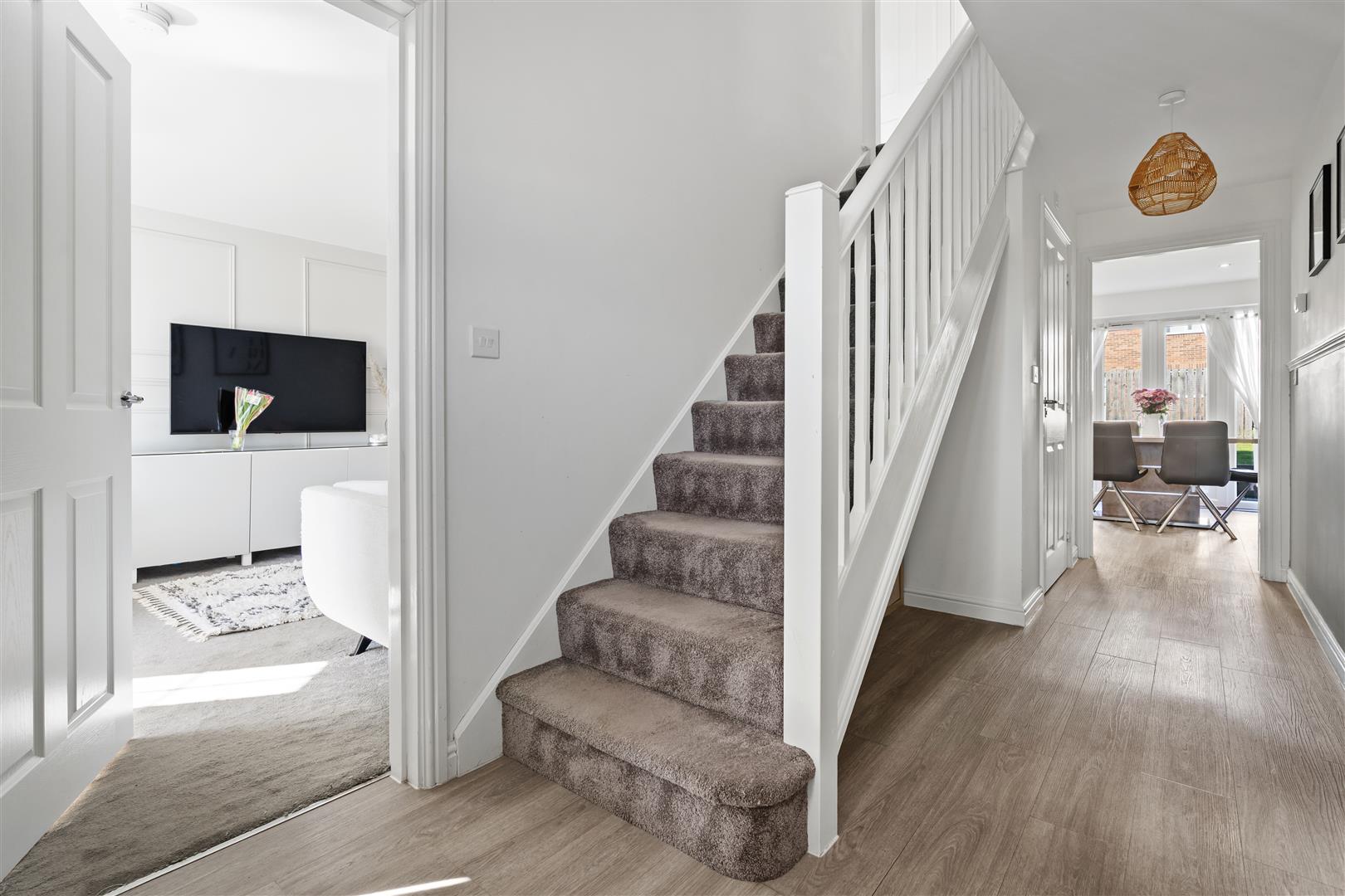 Inviting entrance hall with stairs to the first-floor landing, dado rail, impeccable decor, stylish flooring which flows throughout most of the ground floor.