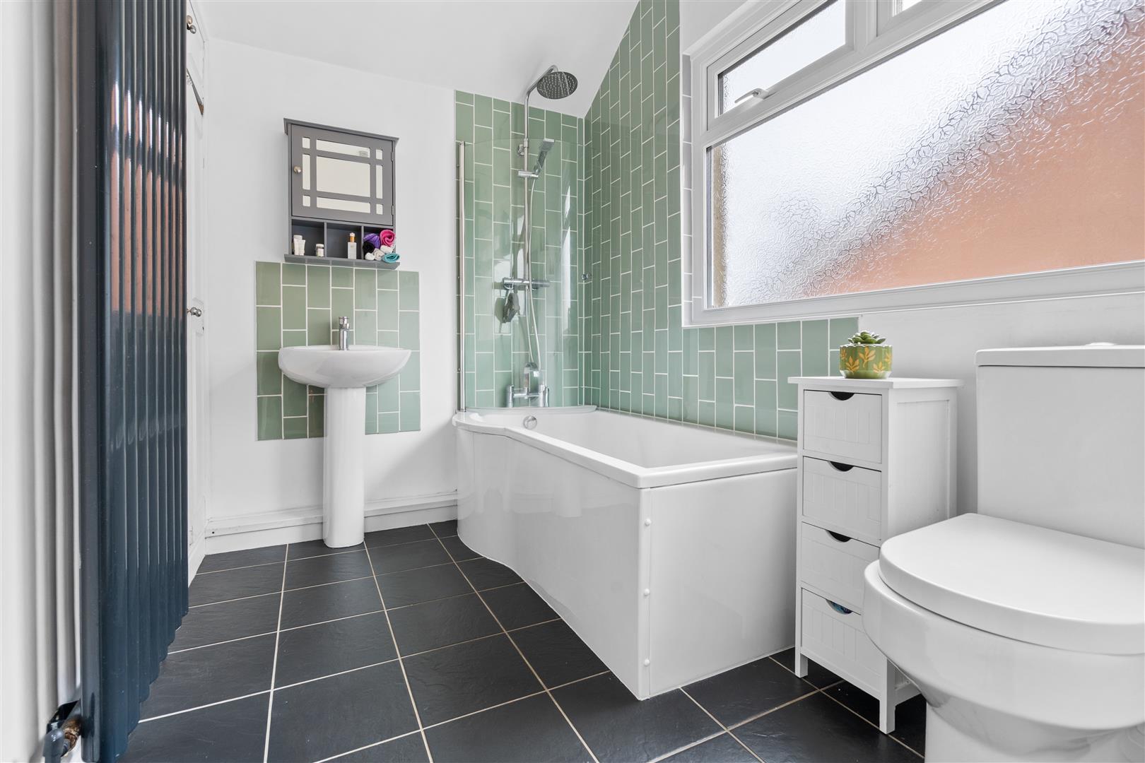 The newly tiled family bathroom comprises 'P' shaped bath, over bath shower and glass shower screen, close coupled WC and pedestal wash basin, stylish subway tiling, with fitted to storage cupboard, anthracite column radiator.