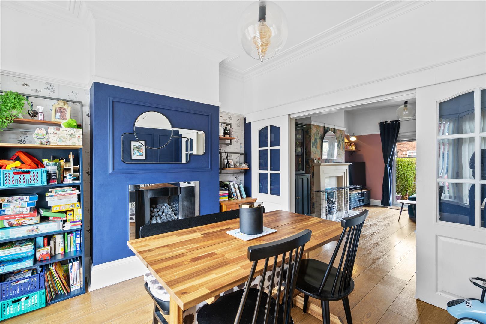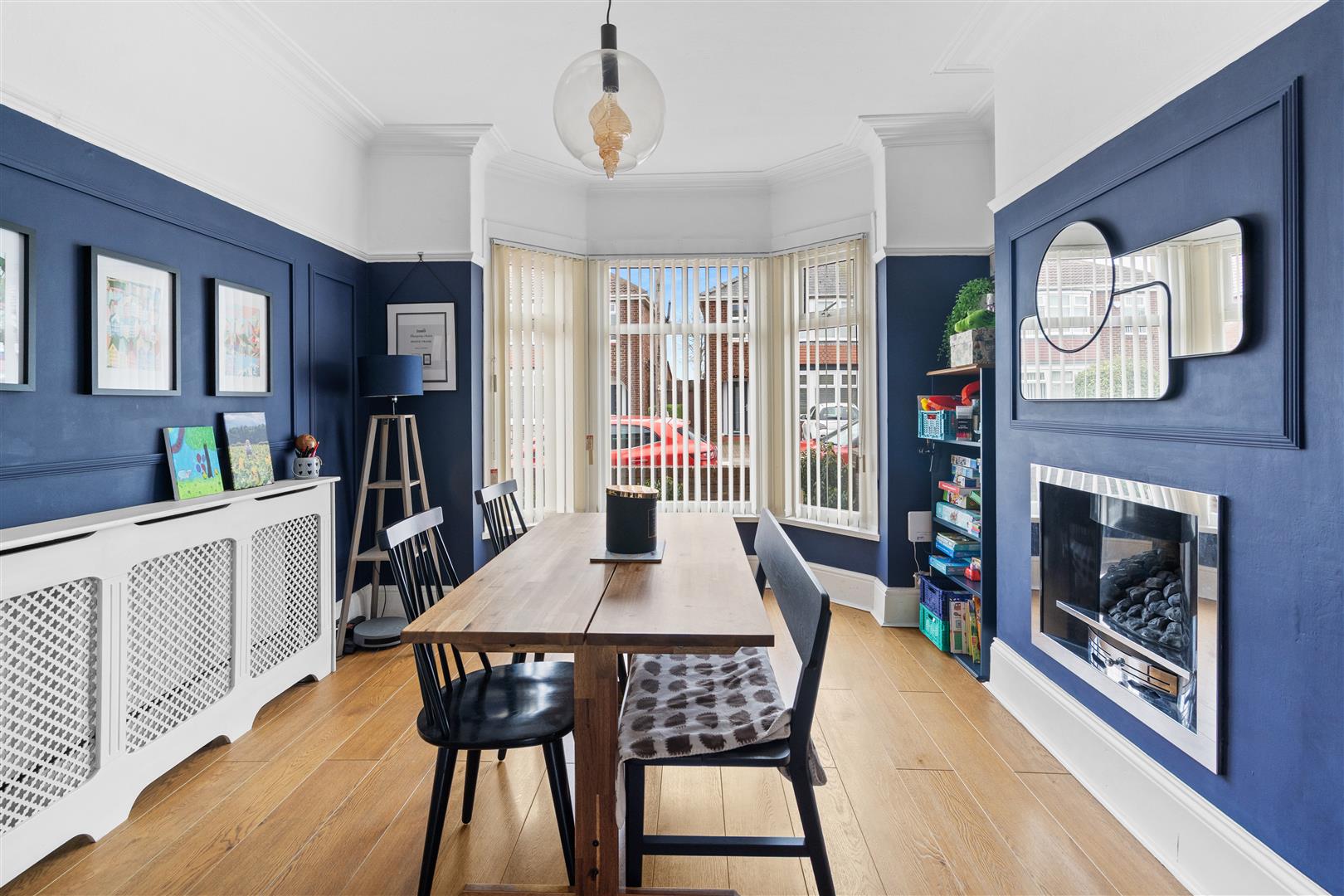 Delightful dining room with bay window to the front elevation, laminate flooring, bespoke wall panelling lovely decor, contemporary chrome coal effect gas fire and doors which open up into;