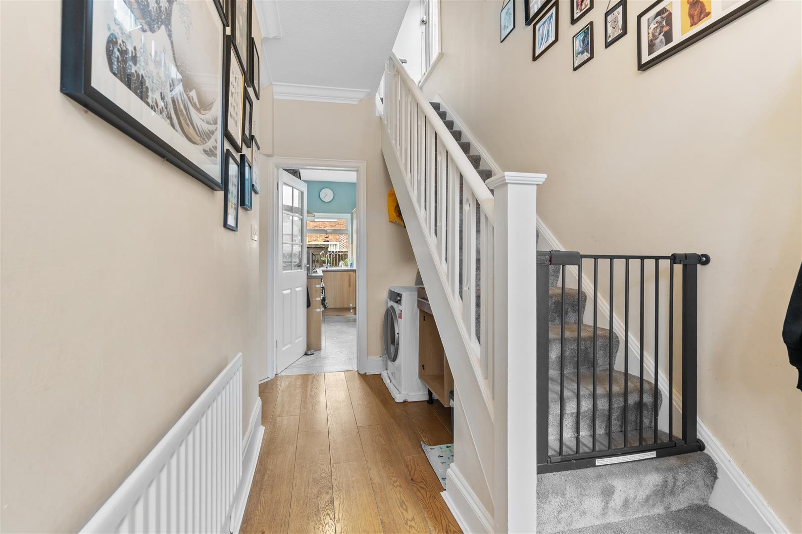 Entrance hallway with stairs to the first floor accommodation, laminate flooring, neutral decor, decorative coving.