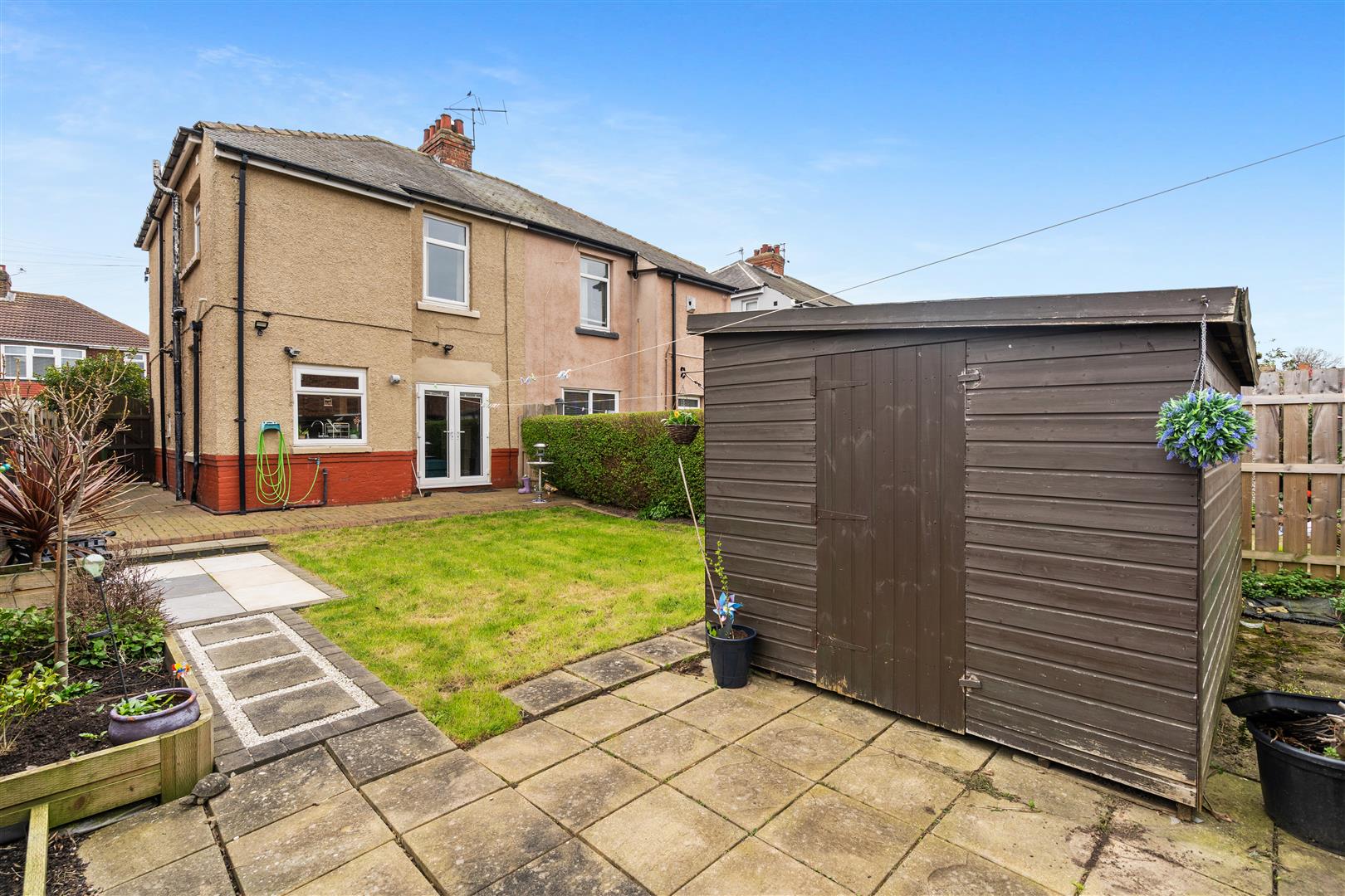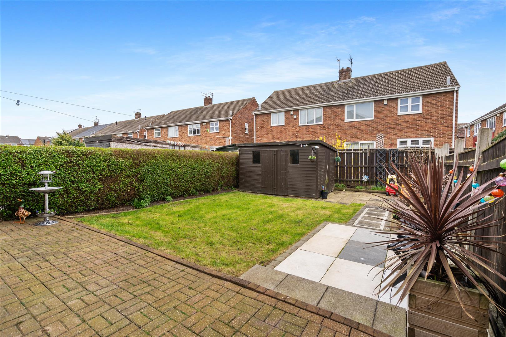 To the rear and enclosed garden laid to lawn with block paved patio area, mature hedging, established borders, and garden shed with electricity supply, side access.