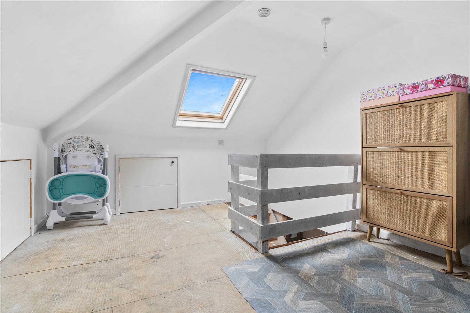 To the second floor, there is a large, fully converted loft room with stairs, vaulted ceiling, eaves storage, neutral decor and Velux window.