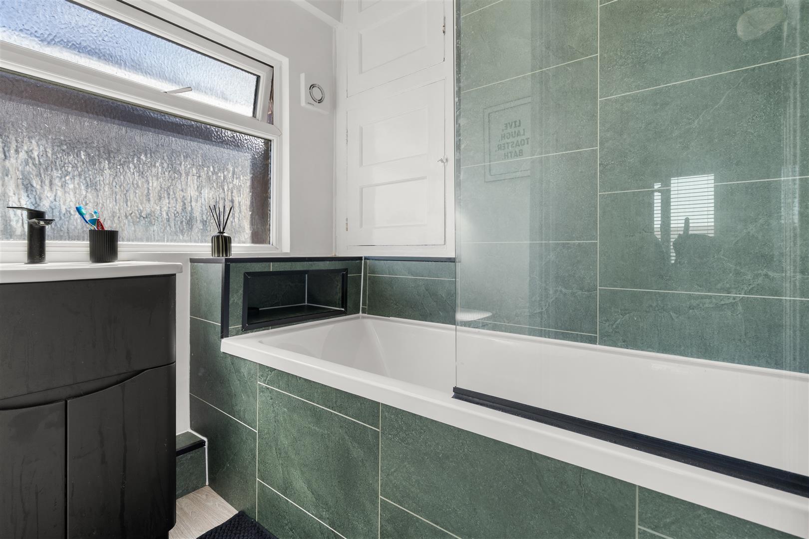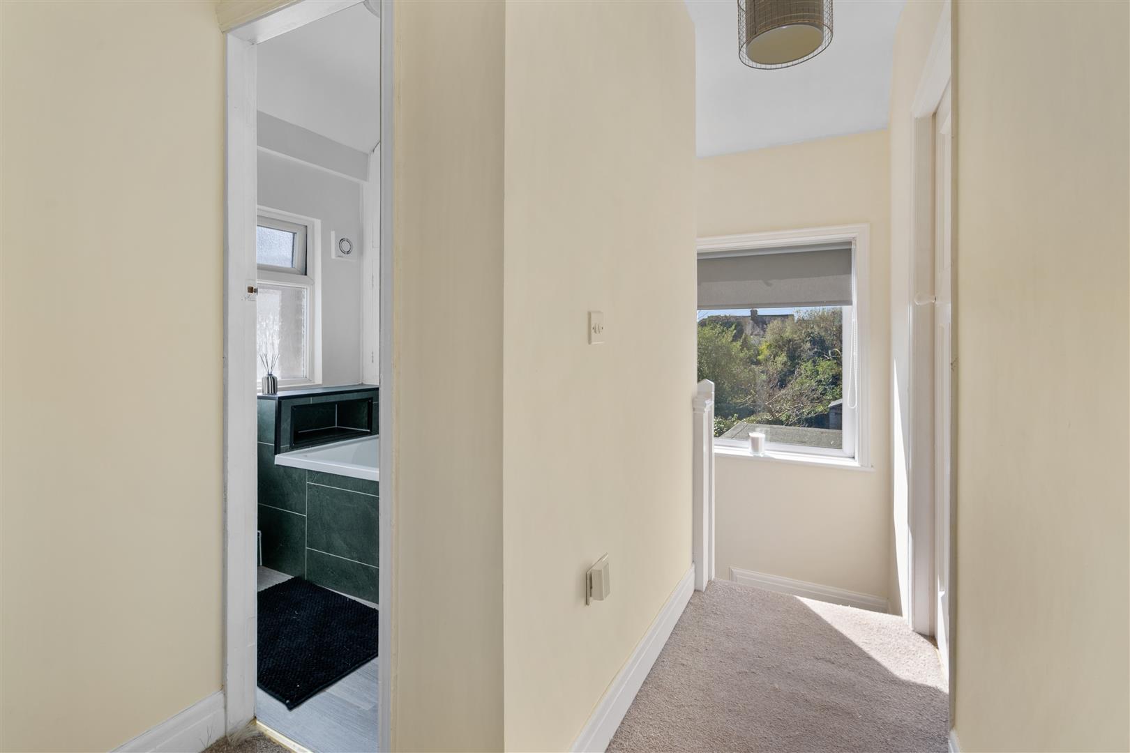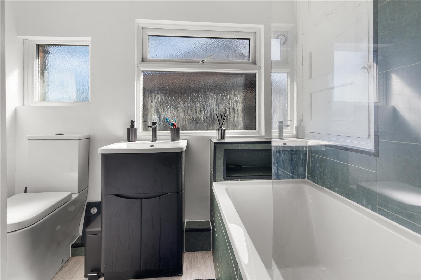 To the first floor are three well-proportioned bedrooms, including a generous master bedroom with pleasant open outlooks, a second double bedroom, and a third single room ideal as a nursery, home office, or guest room. The accommodation is completed by a modern family bathroom, fitted with a sleek suite and bath with over head shower.