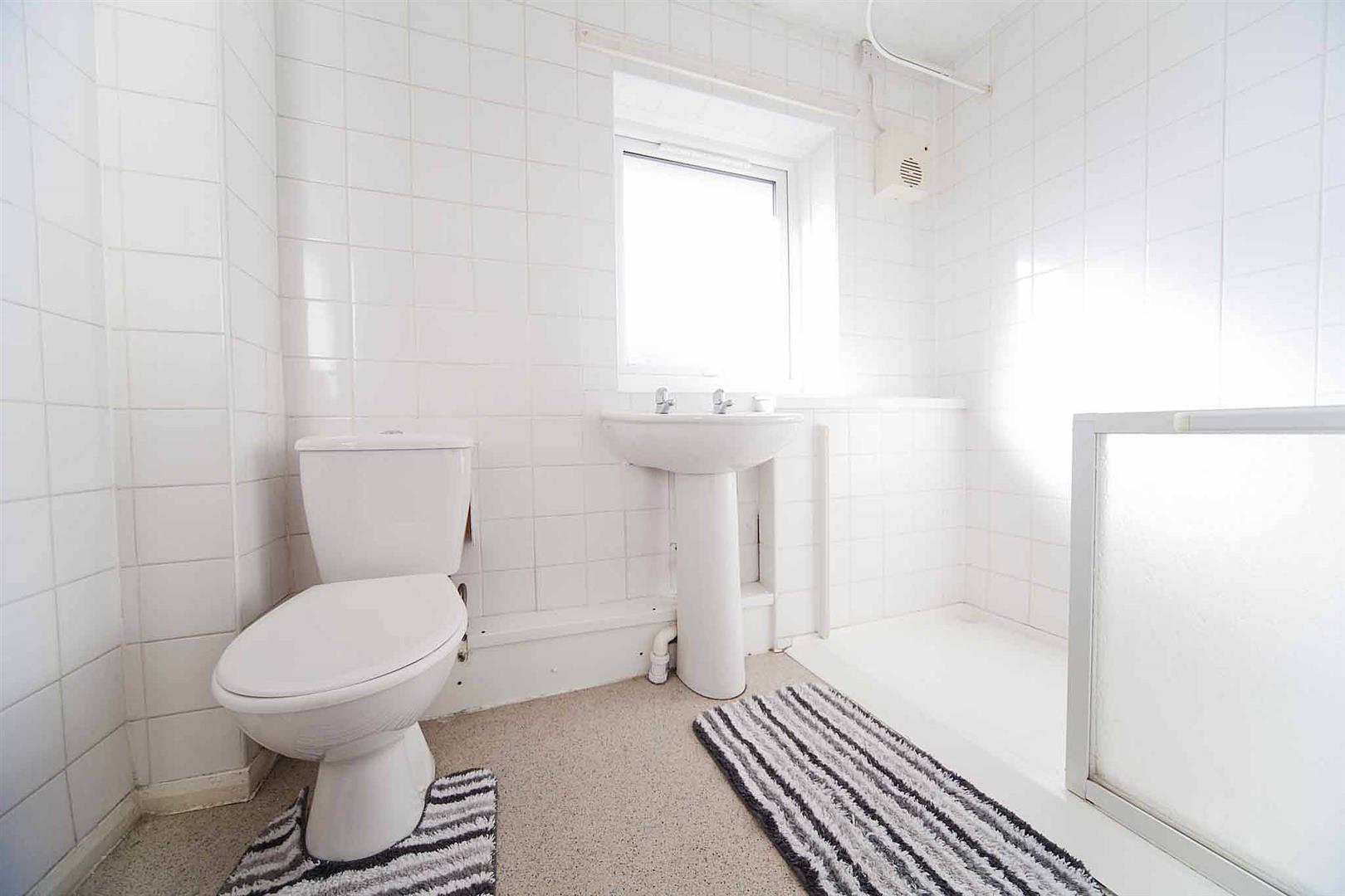 The family wet room comprises shower, close coupled WC, and pedestal wash basin, modern panelling.