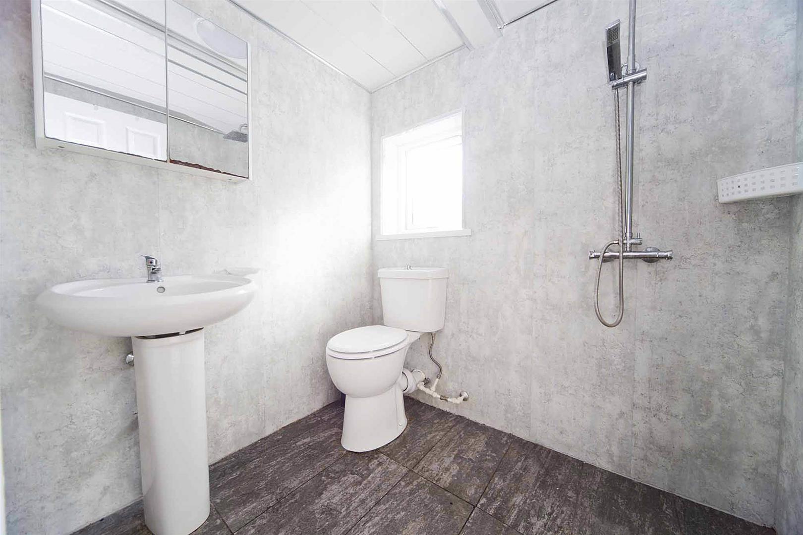Guest shower room comprising close coupled WC, wash basin and large shower enclosure, fully tiled and with anti slip flooring.