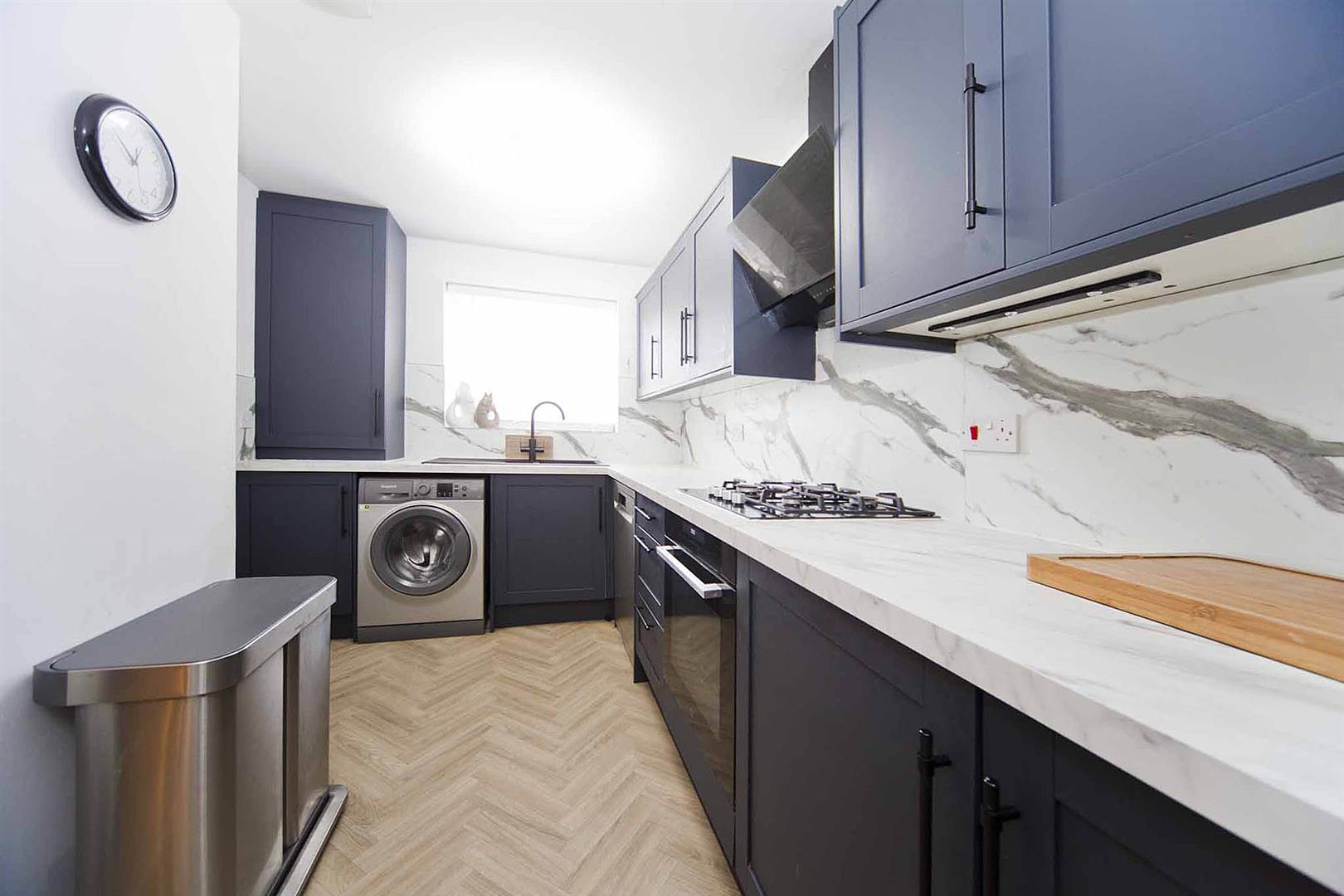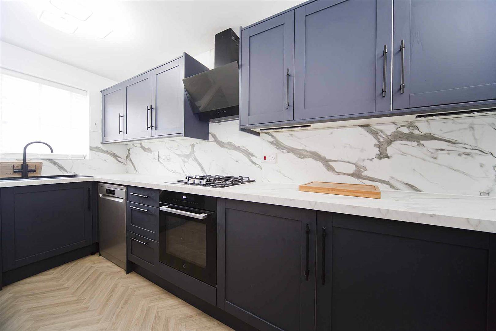 Kitchen diner newly fitted with an array of shaker style wall, base, and drawer cabinetry, solid marble surfaces and backsplash, integrated oven, integrated gas hob, integrated extractor, space for dishwasher, sink with mixer tap, plumbing for washing machine, space for fridge freezer, space to dine.