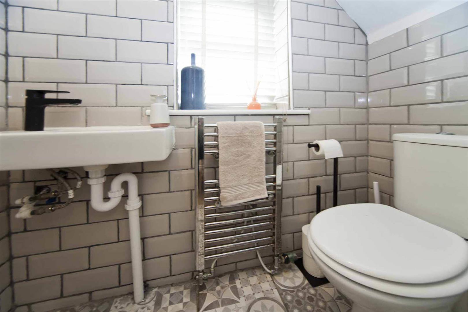 Guest cloakroom comprising close coupled WC and wall mounted wash basin, chrome heated towel radiator, with complimentary tiling and flooring.