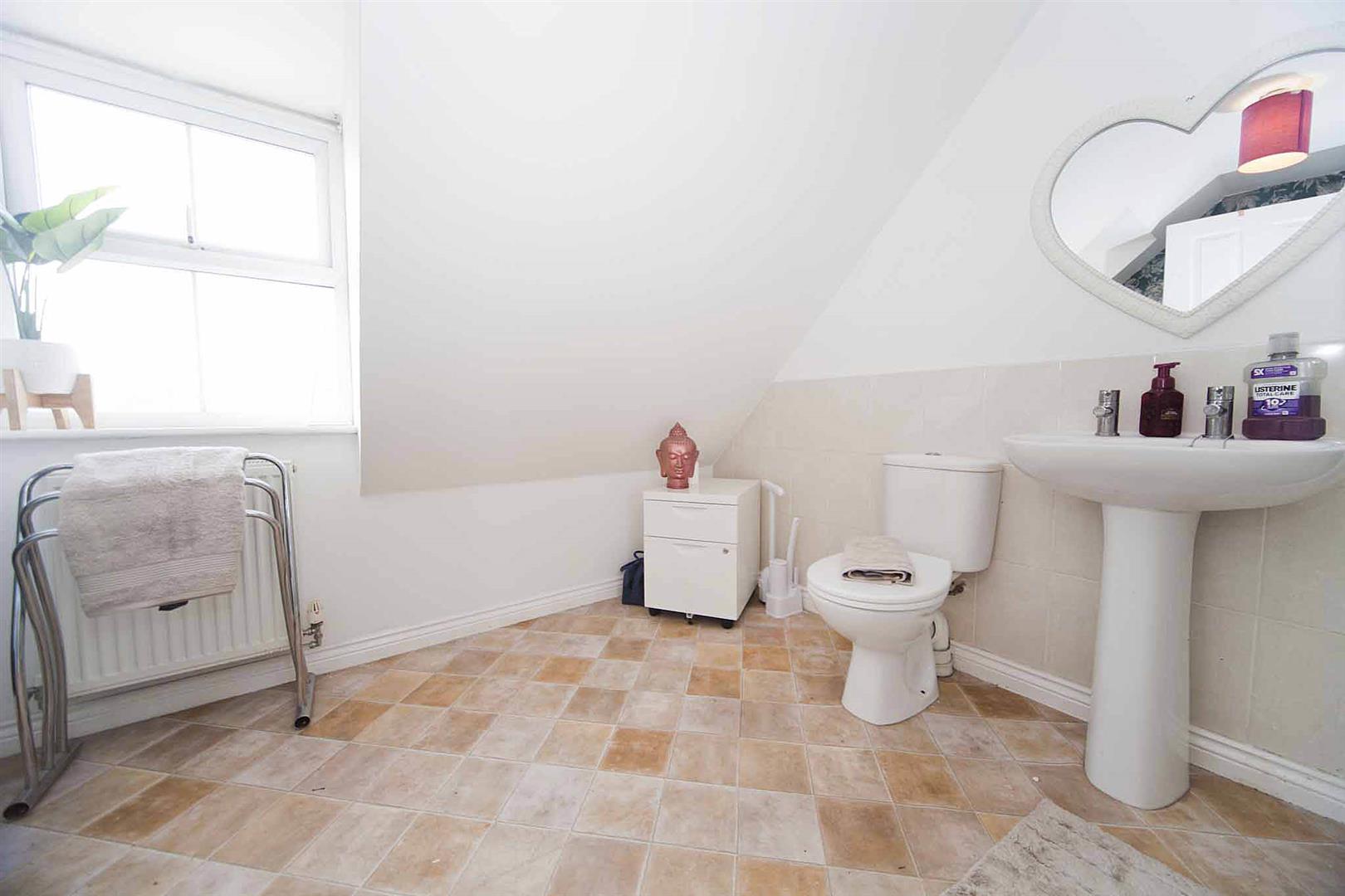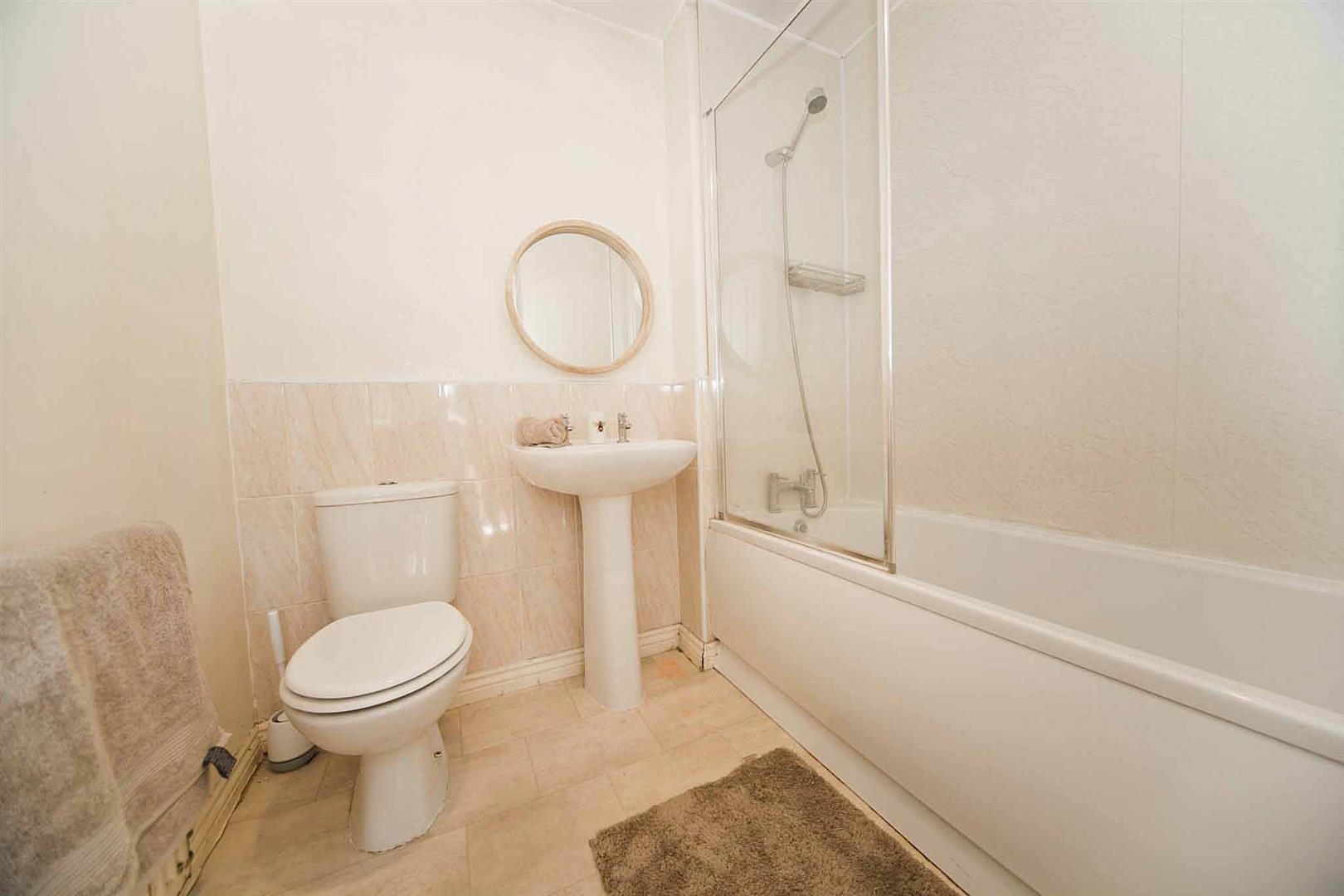 The family bathroom comprises Bath, with over bath shower and glass shower screen, close coupled WC and pedestal wash basin with complimentary tiling.