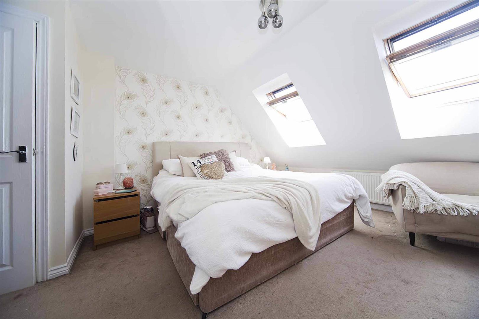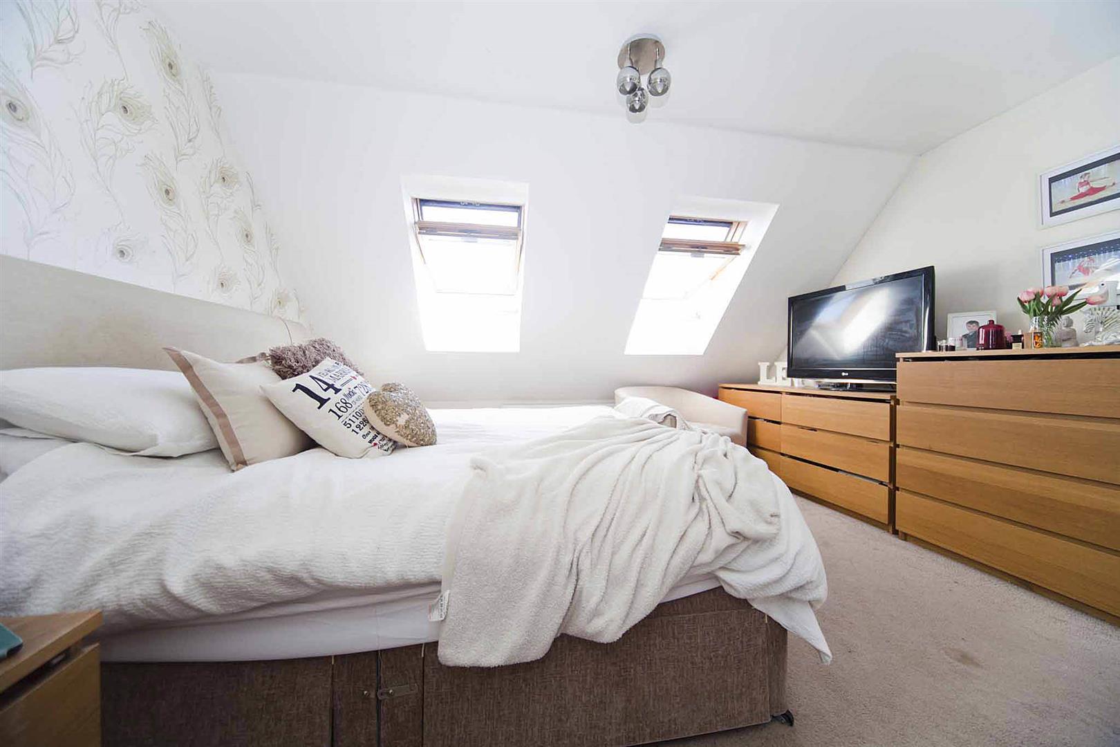 Master bedroom with twin Velux window windows to the rear, beautiful decor, fitted storage and fitted wardrobes, and also with access to;