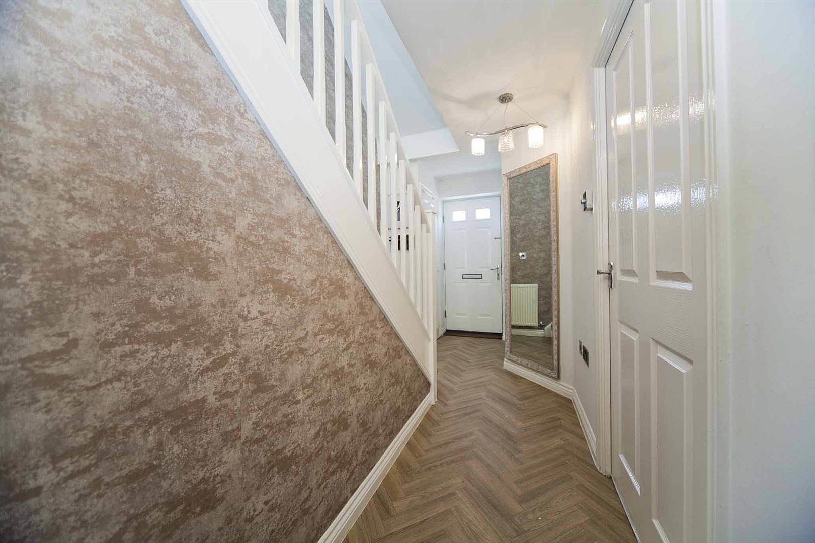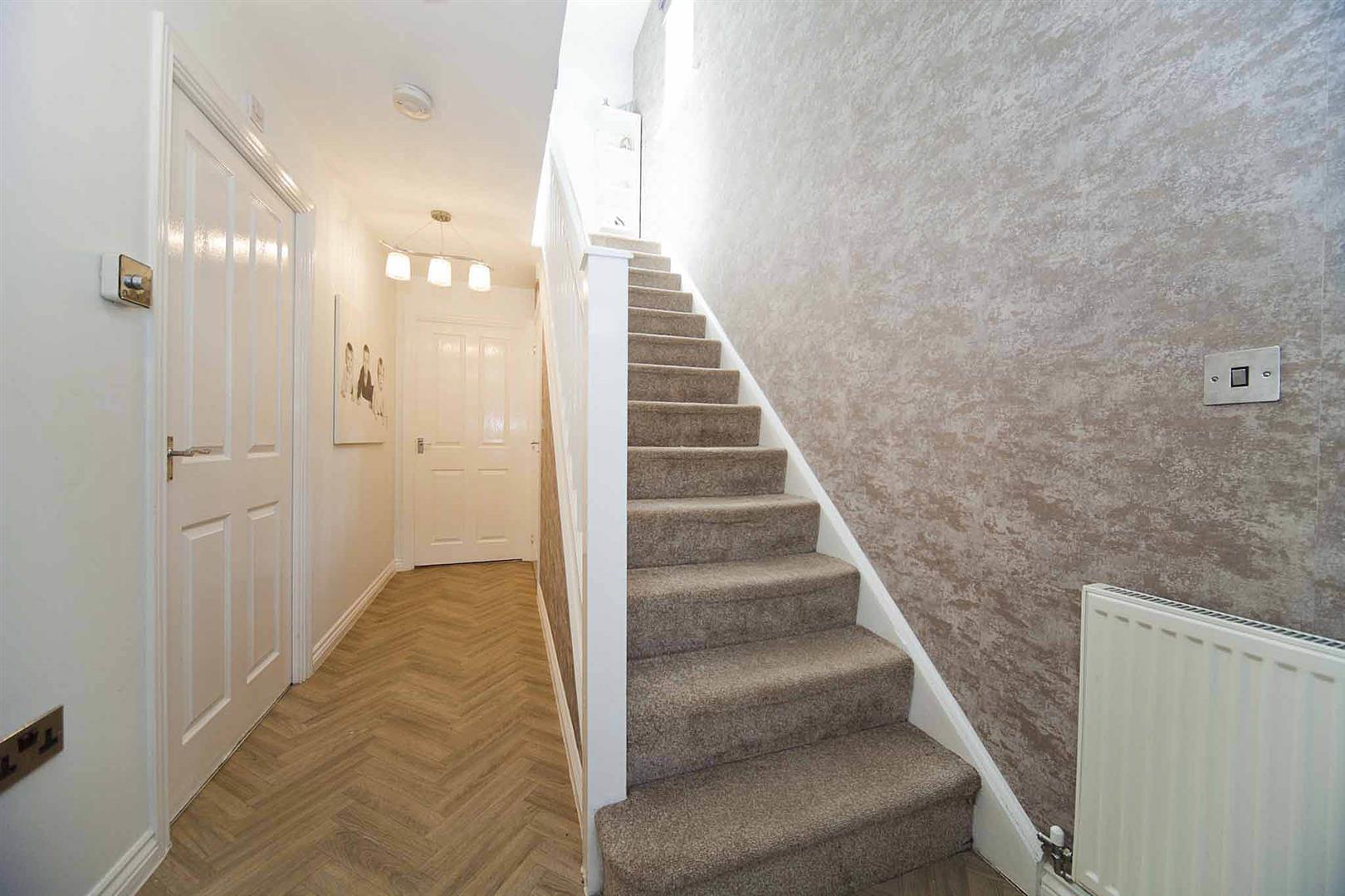 Entrance hallway with fitted storage cupboard and with stairs which lead to the front to the first floor accommodation, impeccable decor, beautiful flooring.