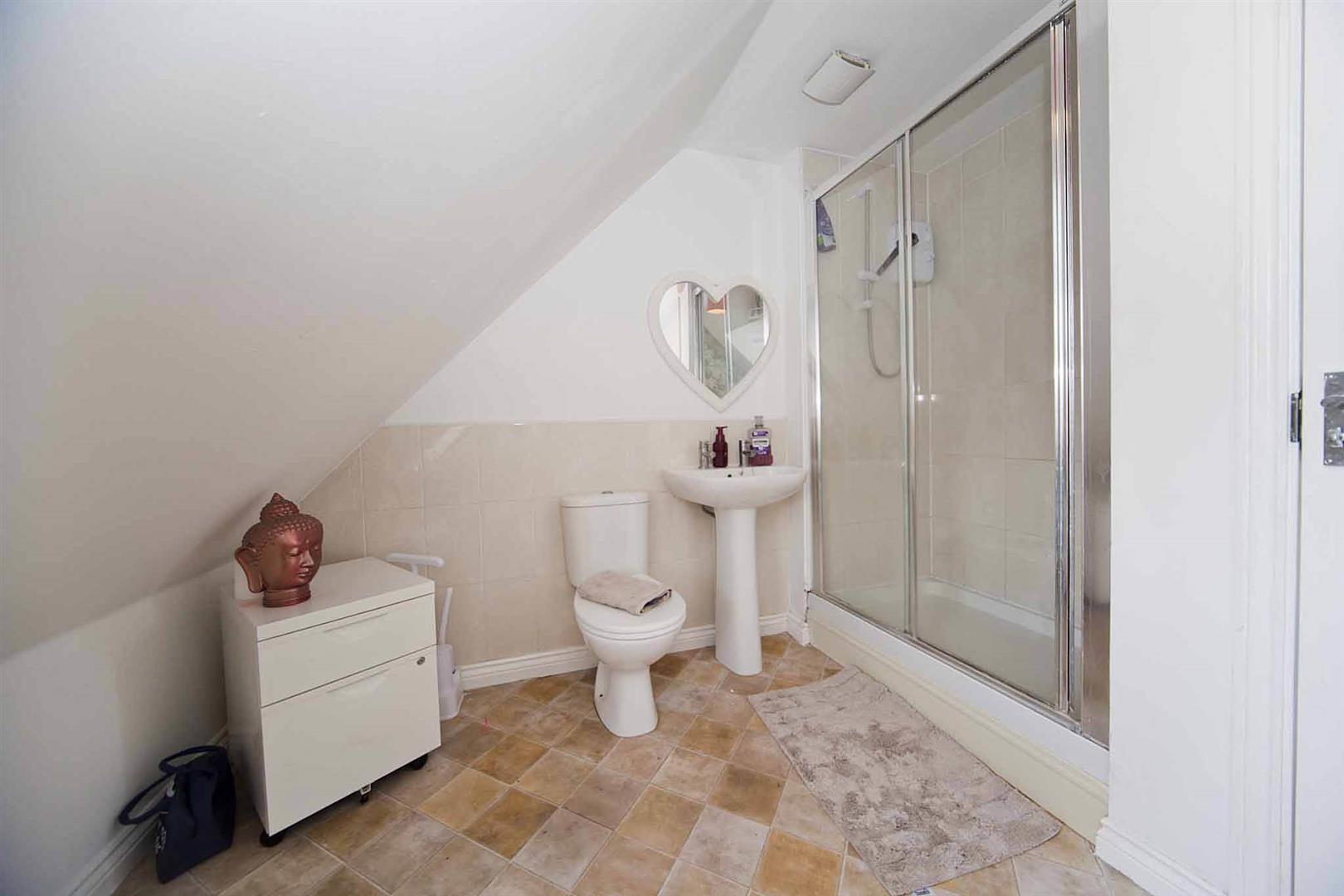 Ensuite shower room of good proportions comprising oversized shower enclosure, close coupled WC and pedestal wash basin with complimentary tiling.