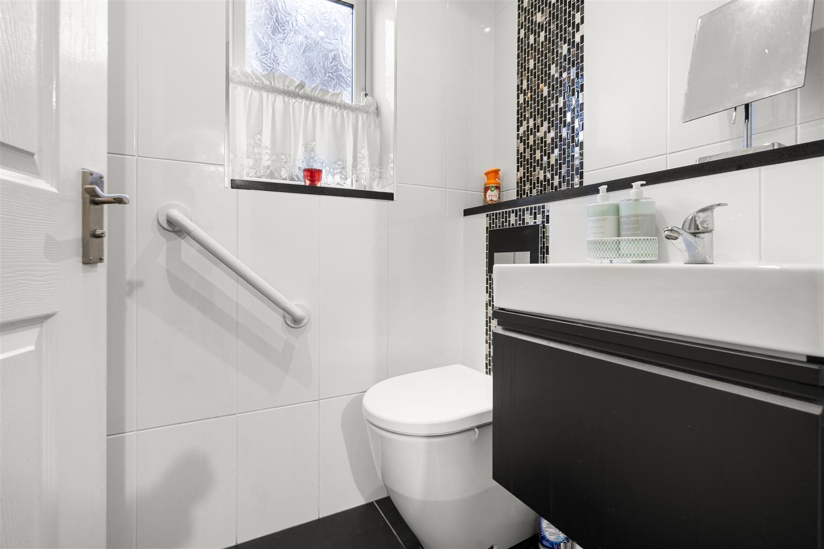Guest cloakroom comprising concealed cistern WC and wall mounted vanity wash basin, beautiful tiling.