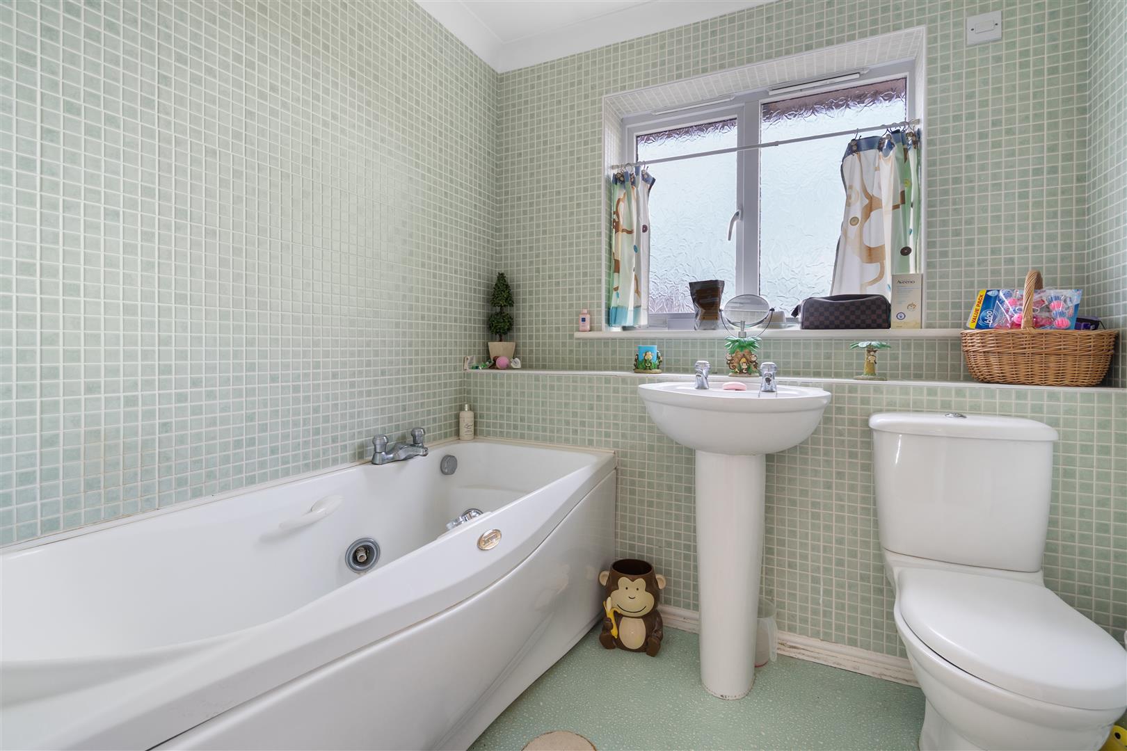 The family bathroom comprises bath, close coupled WC and pedestal wash basin with complimentary mosaic tiling.