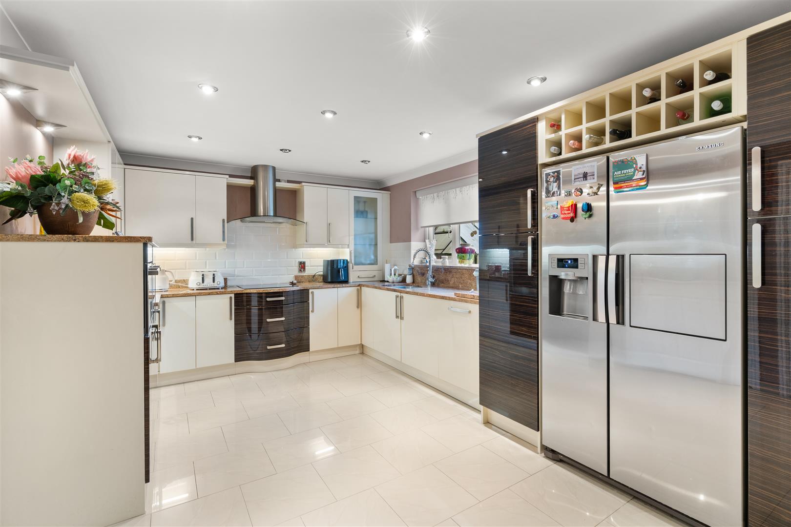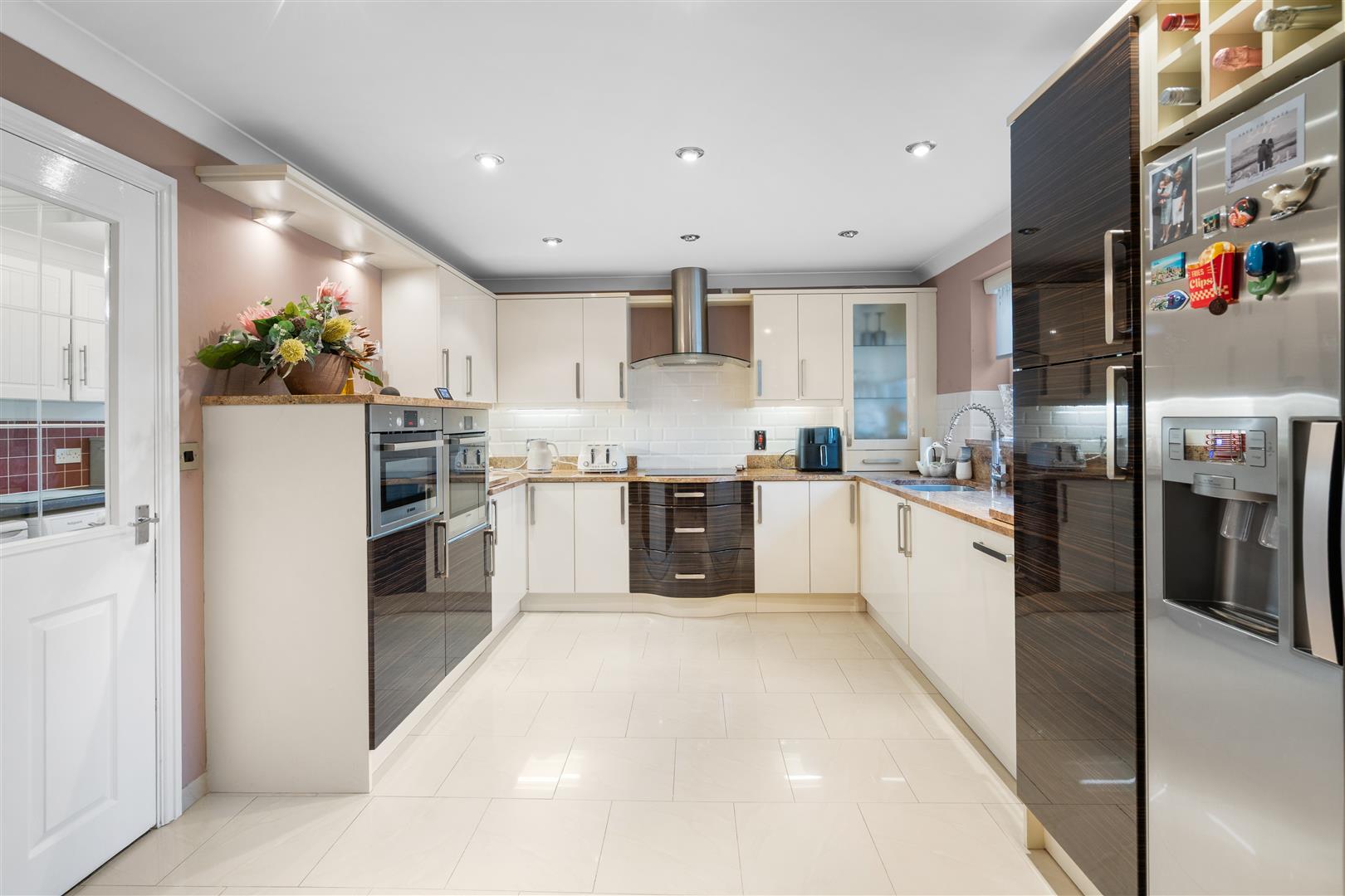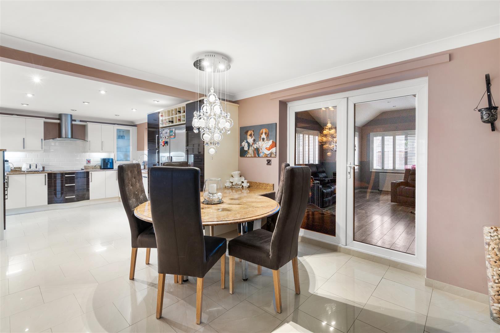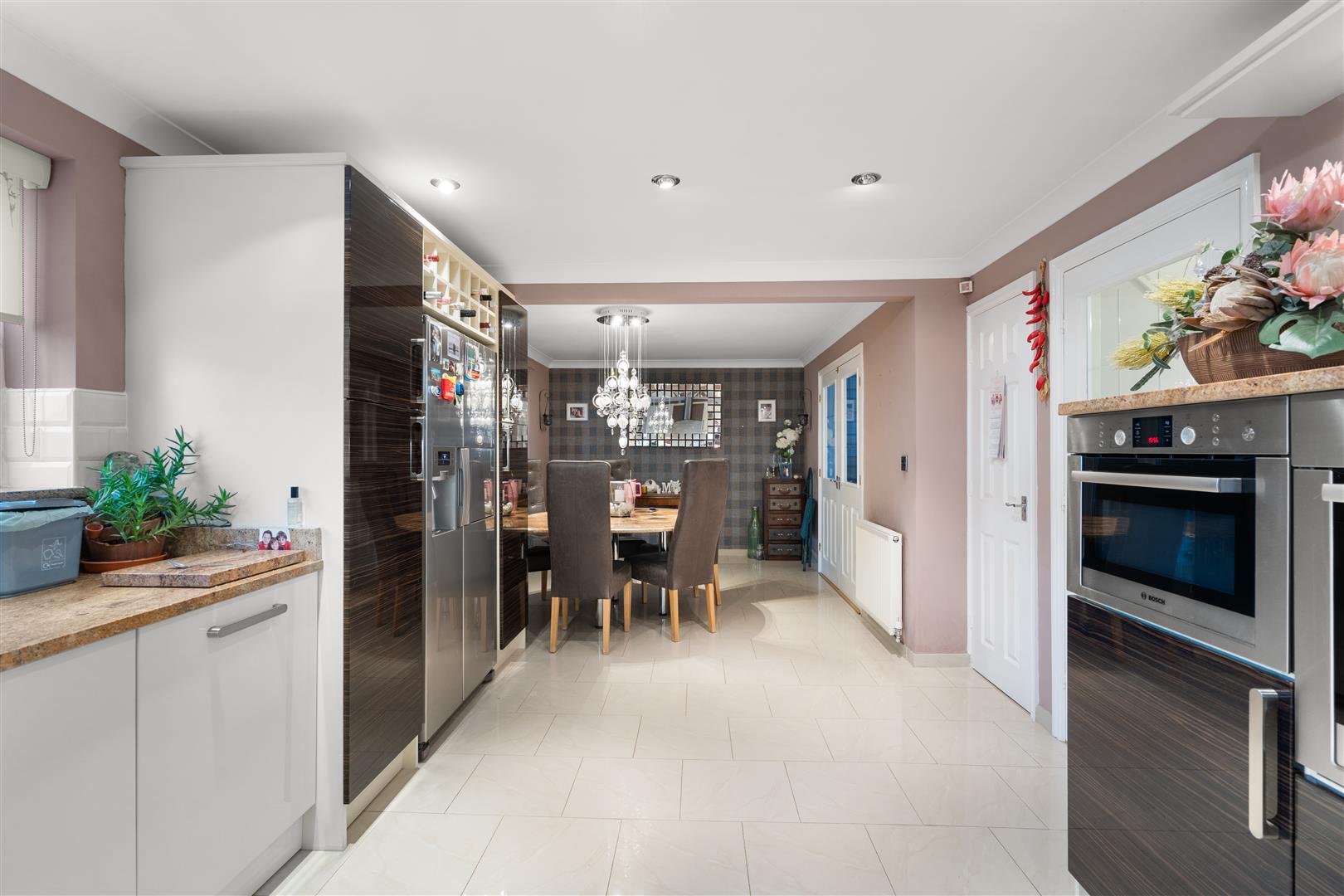 Open plan kitchen dining room fitted with a range of two tone high gloss larder, display, wall, base, and drawer cabinetry, complimentary surfaces, integrated oven, integrated microwave, integrated induction hob, integrated extractor, integrated dishwasher, wine rack, inset sink with American style jet swivel mixer tap, space for American fridge freezer, ample space to dine, recessed spotlights, tiled floor, double doors leading into;