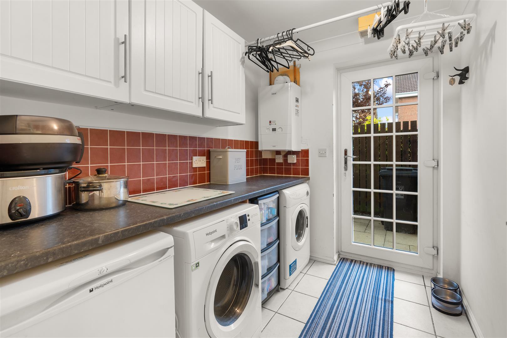 Useful utility room with space for tumble dryer and plumbing for washing machine, space to perform laundry duties with fitted cabinetry and work surfaces, tiled backsplash, exterior Georgian glazed door, tiled floor.