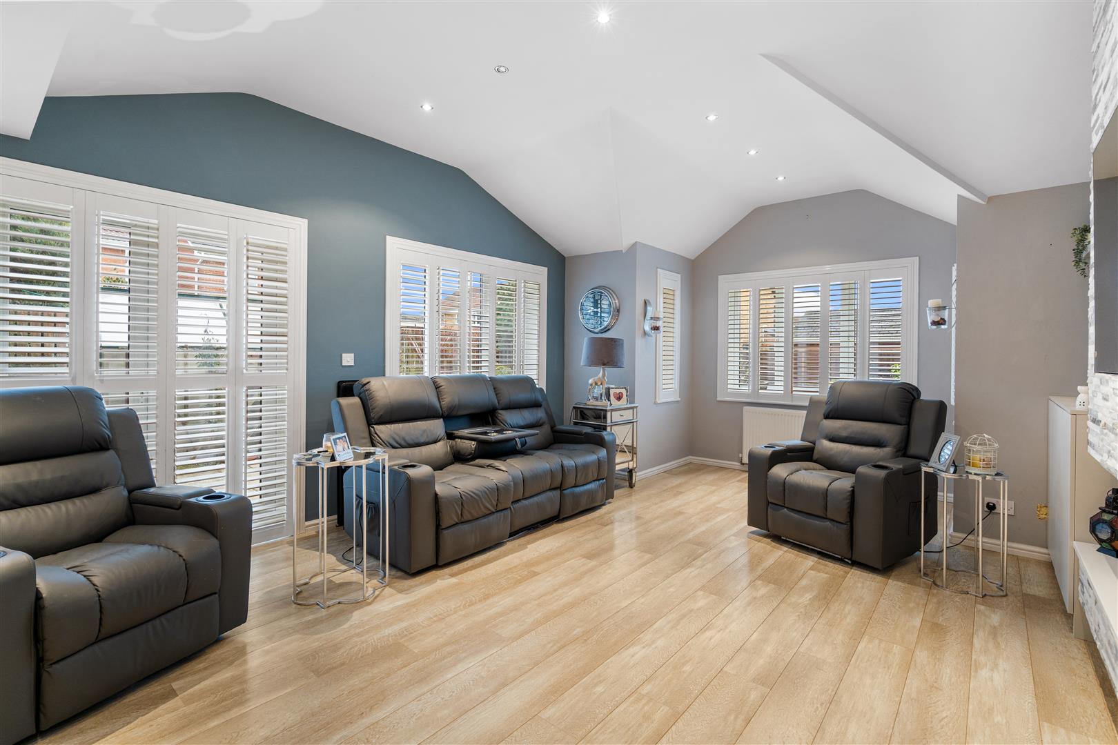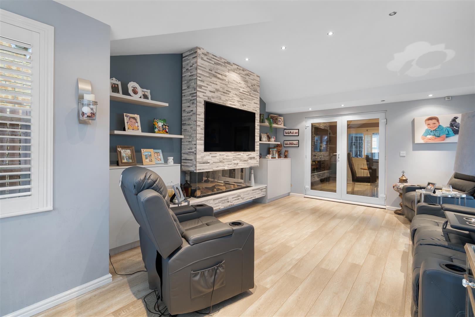 Garden room extension situated to the rear with French doors which open to the rear garden and with vaulted ceiling, recessed spotlights, plantation shutters, fitted storage cupboard, media wall with contemporary fireplace, laminate floor, stylish decor.