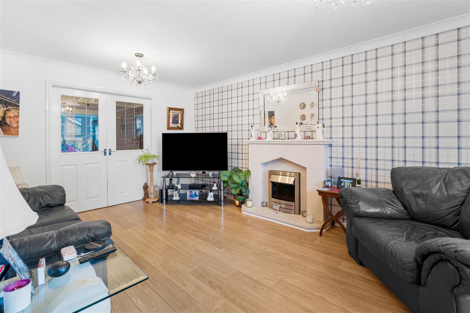 Excellent lounge with bay window to the front of the property and feature fireplace with chrome inset electric fire, delightful decor, decorative coving, laminate flooring, double doors which lead into;