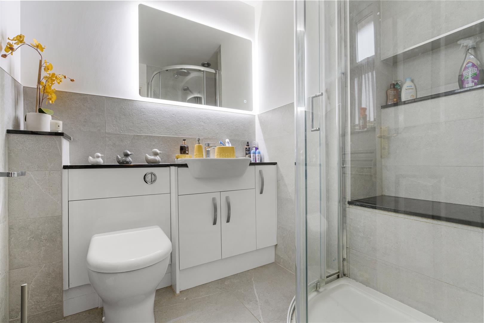 Ensuite shower room comprising quadrant shower closure, concealed cistern WC and vanity wash basin combination unit with illuminated mirror with blue tooth speaker, heated towel radiator, complimentary tiling.
