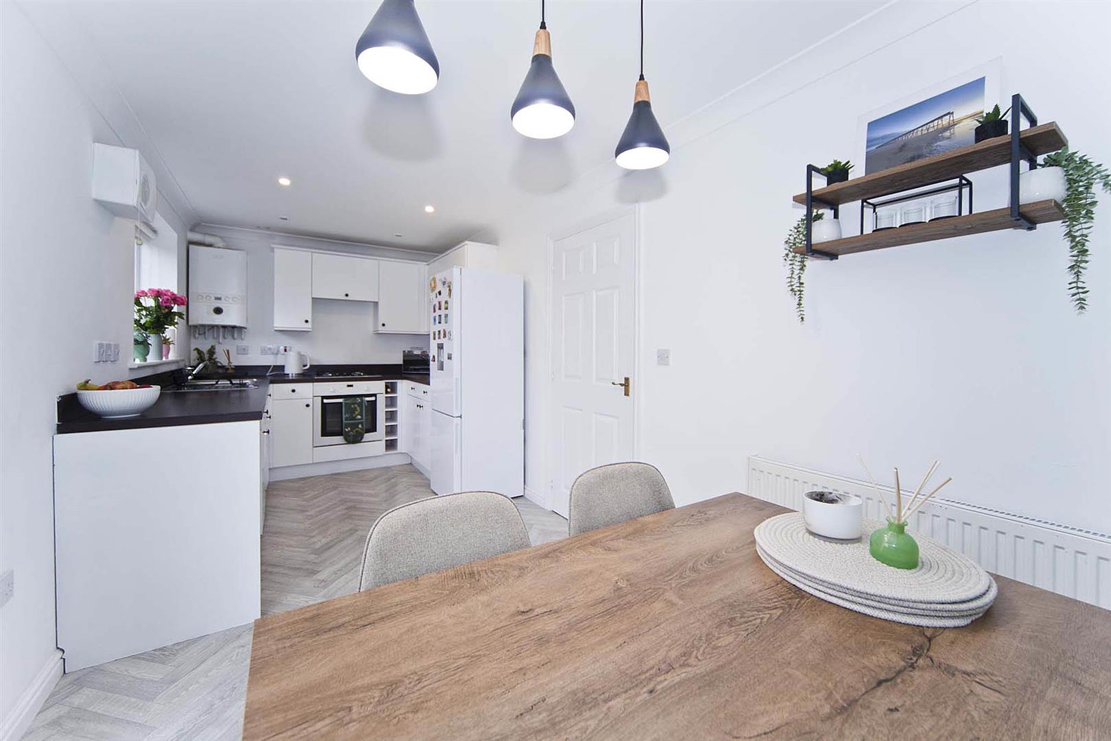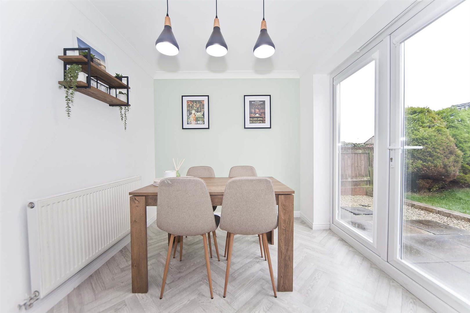 The kitchen is flooded with natural light, neutrally decorated with light, wood effect flooring. It comes equipped with an integrated oven and hob, stainless steel wash basin and tap plus space for appliances. There is also an array of contemporary wall and base units with complimentary work surfaces, Here, you will also find plumbing for a washing machine for all your laundry needs. The flowing layout leads you right into the diner where you overlook the lovely rear garden. Here one can enjoy a morning cup of coffee by the French doors in its privacy.