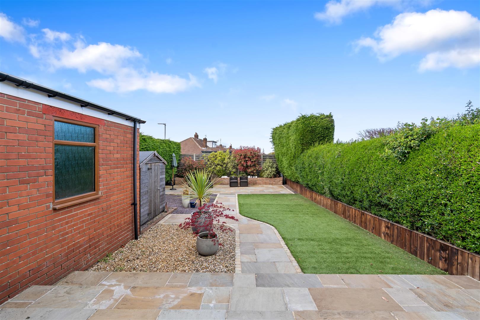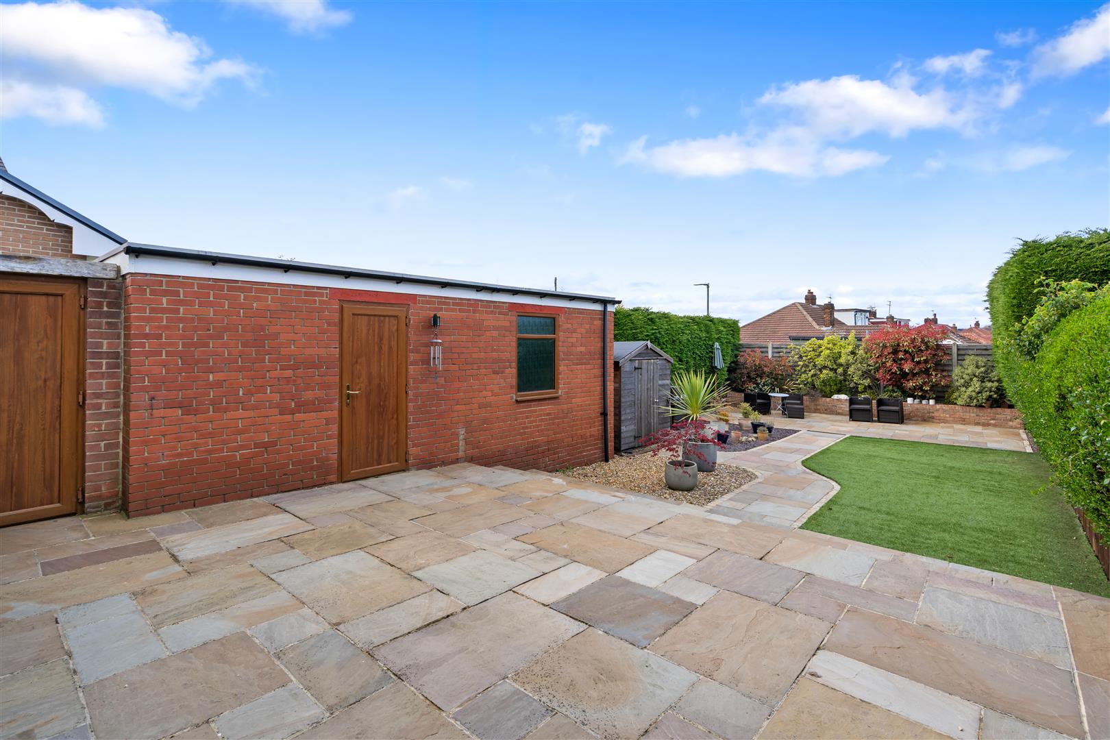 Externally, the rear garden is a standout feature, offering a beautifully landscaped space with patio areas and lawn.